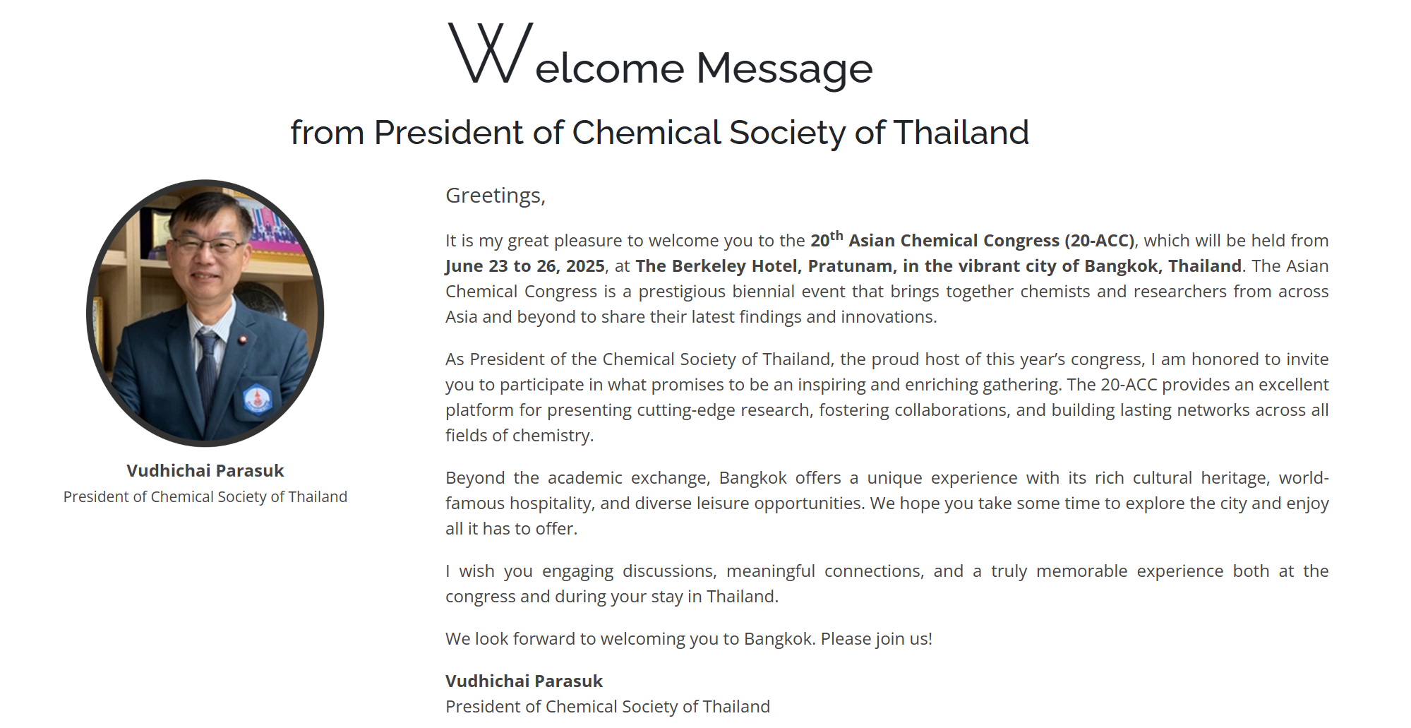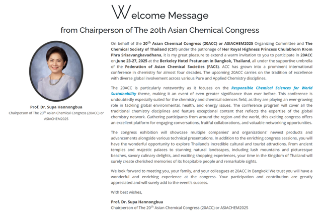 สมาคมเคมีแห่งประเทศไทยฯ ขอเรียนเชิญคณะกรรมการบริหาร สมาชิกสมาคม และนักวิจัยที่สนใจทุกท่านเข้าร่วมงานประชุมวิชาการนานาชาติ The 20th Asian Chemical Congress (20ACC) 2025 หรือ ASIACHEM 2025 ระหว่างวันที่ 23-27 มิถุนายน 2568 ภายใต้หัวข้อการประชุมหลักคือ “Responsible Chemical Sciences for World Sustainability” ณ Berkeley Hotel Pratunam กรุงเทพฯ โดยสมาคมเคมีแห่งประเทศไทยฯ ได้รับสิทธิ์ให้เป็นเจ้าภาพจัดงานประชุมวิชาการดังกล่าวจาก The Federation of Asian Chemical Societies (FACS) และเจ้าภาพร่วมคือ มหาวิทยาลัยเกษตรศาสตร์ โดย ศาสตราจารย์ ดร.สุภา หารหนองบัว เป็นประธานคณะกรรมการจัดการประชุม วัตถุประสงค์ของงานประชุมเพื่อมุ่งเน้นสื่อสารถึงความรับผิดชอบด้านวิทยาศาสตร์เคมีของสังคม เพื่อความยั่งยืนของโลก การประชุมจะครอบคลุมสาขาวิชาเคมีและมีเนื้อหาพิเศษที่สะท้อนถึงความเชี่ยวชาญของเครือข่ายเคมีทั่วโลก เป็นการประชุมที่รวบรวมผู้เข้าร่วมจากทั่วทุกภูมิภาคและทั่วโลก  ข้อมูลเพิ่มเติมที่ www.acc2025thailand.com