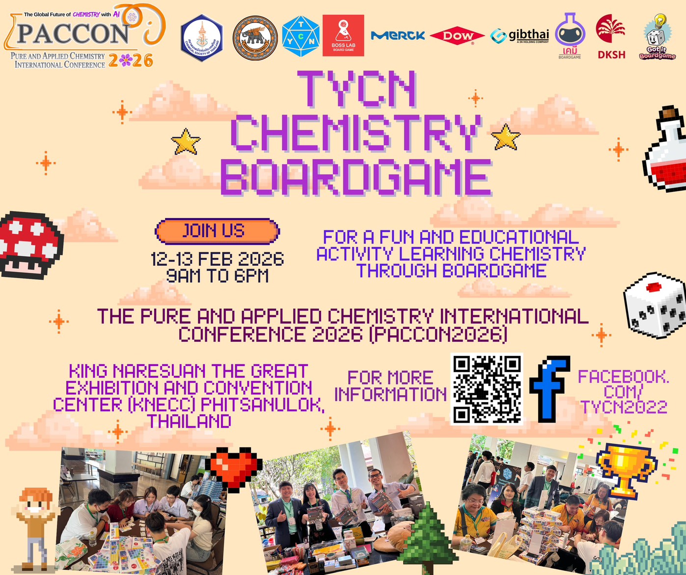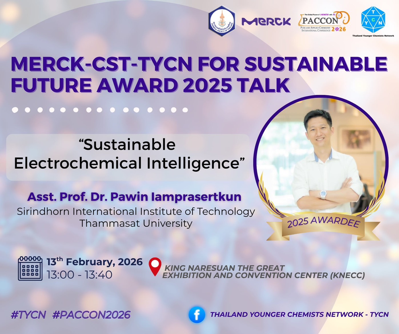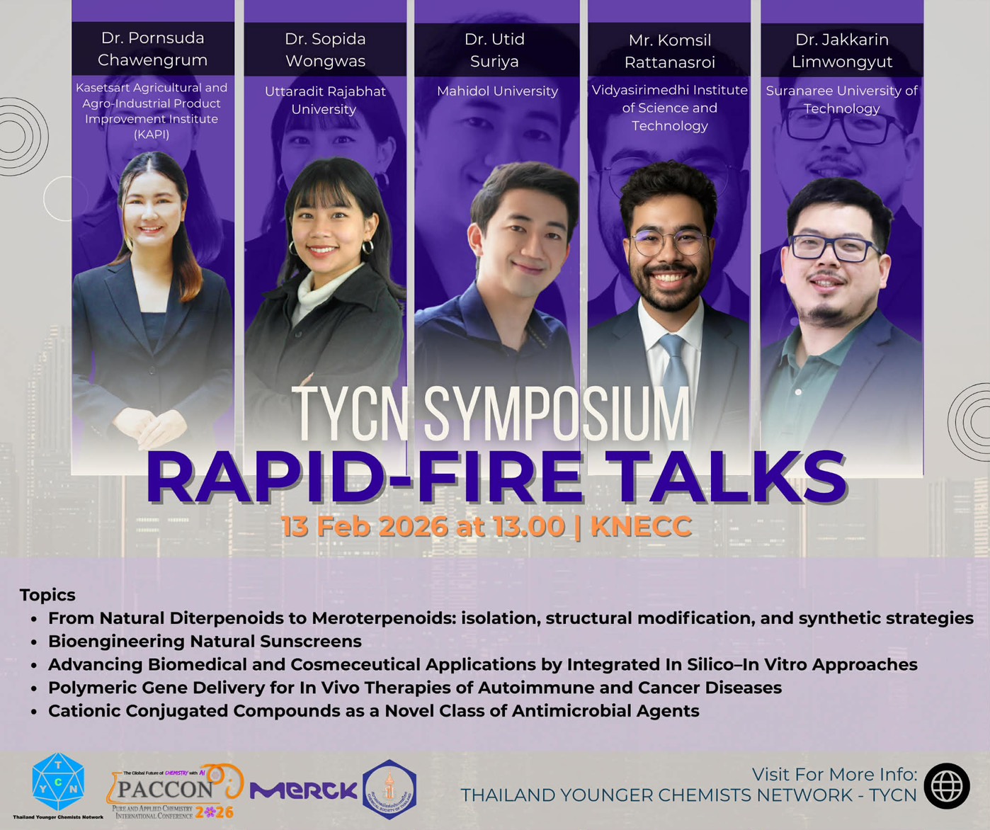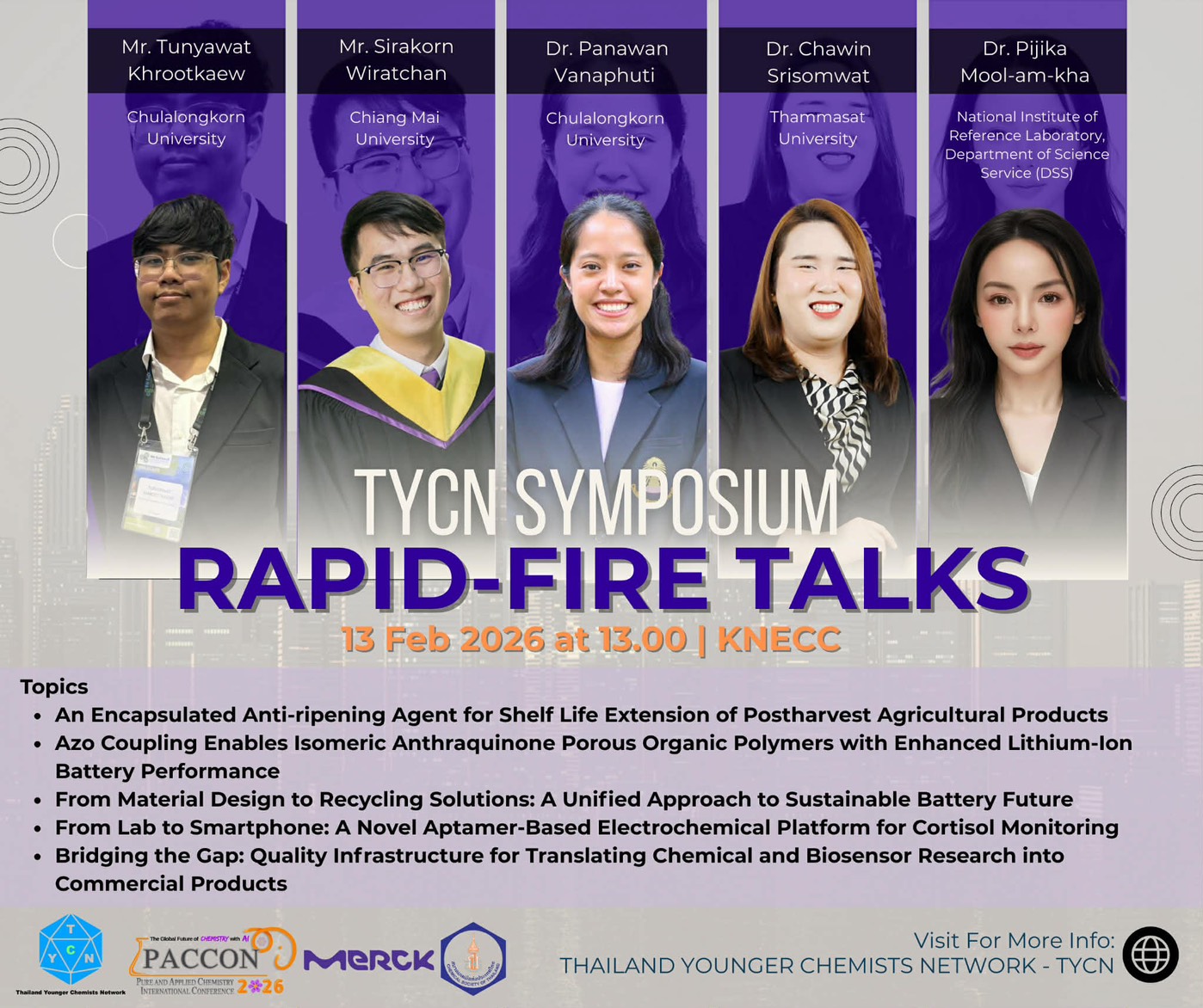 สมาคมเคมีแห่งประเทศไทยฯ ขอเรียนเชิญสมาชิก นักวิจัย อาจารย์ นิสิตนักศึกษา ผู้ที่สนใจทั่วไป เข้าร่วมกิจกรรม MERCK-CST-TYCN Symposium 2026 ในการประชุมวิชาการนานาชาติ PACCON2026 จัดโดย MERCK, Thailand Younger Chemists Network (TYCN) และสมาคมเคมีแห่งประเทศไทยฯ ในวันศุกร์ที่ 13 กุมภาพันธ์ 2569 เวลา 13.00-15.30 น. ณ King Naresuan the Great Exhibition and Convention Center (KNECC) จ.พิษณุโลก